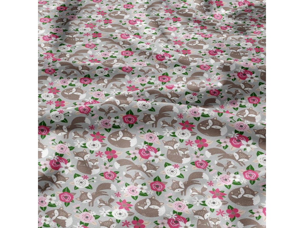 Bavlněná látka Kytičky Růžové a lišky na Šedém