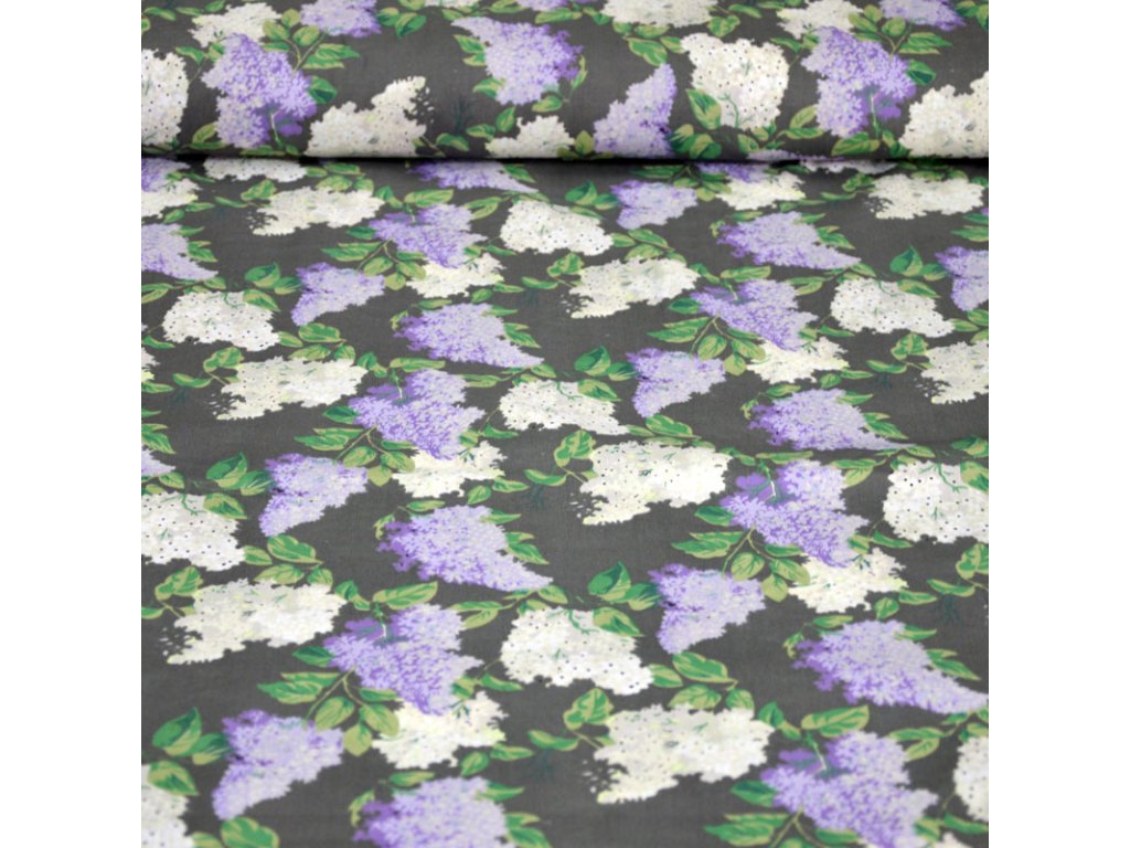 Bavlněná látka Větve šeříku Bílé a Fialové na Šedém