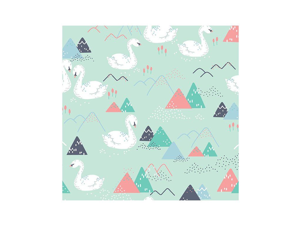 Bavlněné látky, metráž. Labutě na Mentolovém