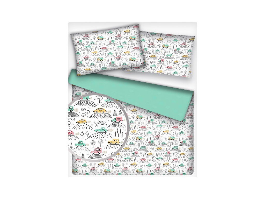 Dětská bavlněná látka metráž Autička na Mentolovém