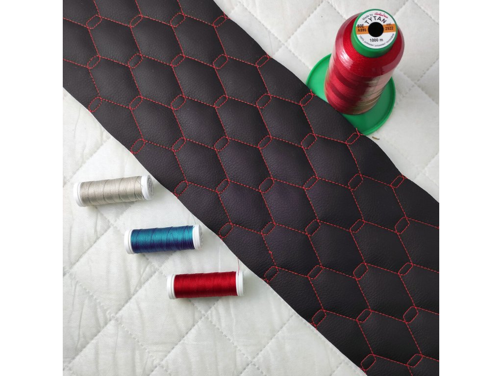 Ekokůže GEO barva Černá prošívaná Červenými nitěmi, koženka metráž