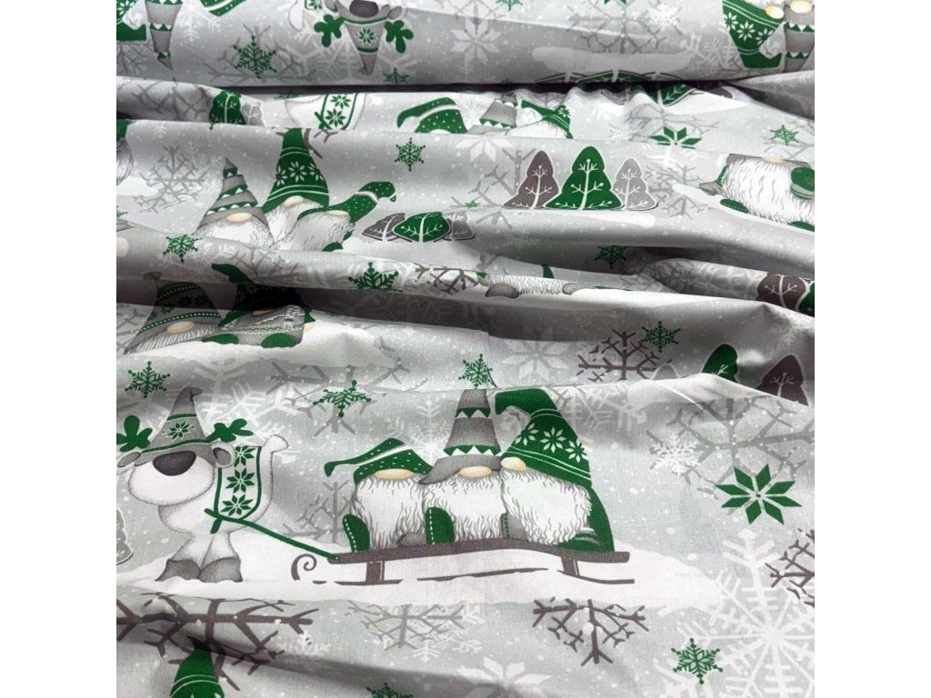Vánoční bavlněná látka, metráž, šíře 160 cm, Skřítci Tm.Zelené na Šedém