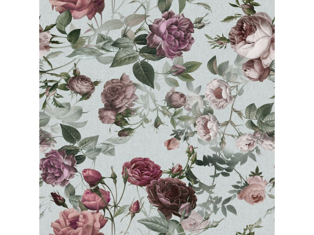 Velurové potahové látky s potiskem. Květiny na bledě Mentolovém